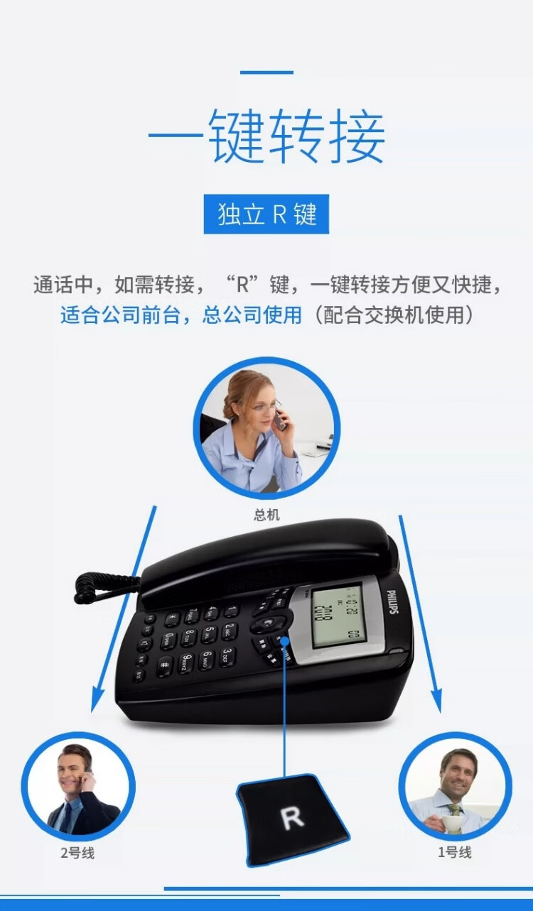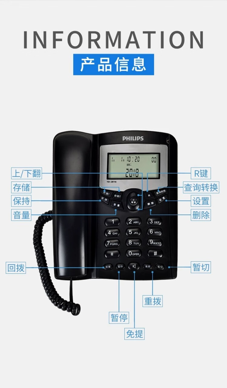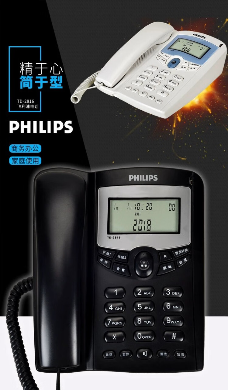 飞利浦 TD2816 固定电话机座机来电显示双插口免电池办公 黑