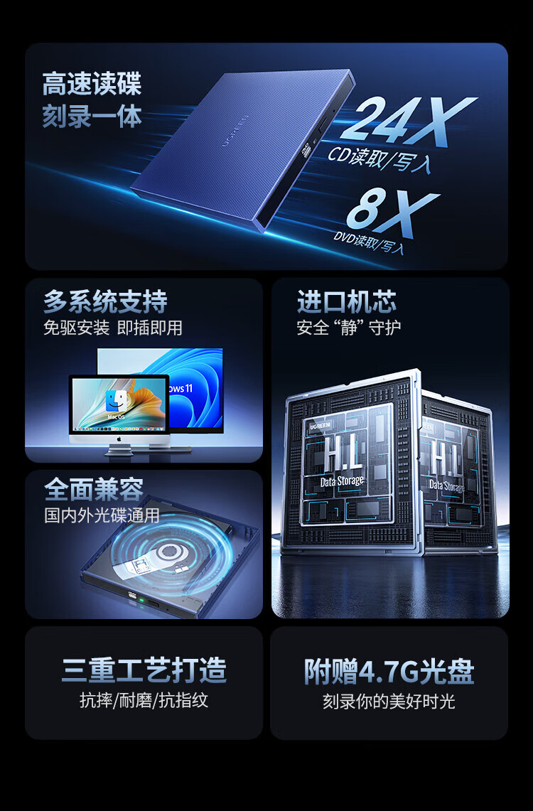 绿联 USB外置移动光驱8倍速 DVD光盘刻录机 外接光驱CM138