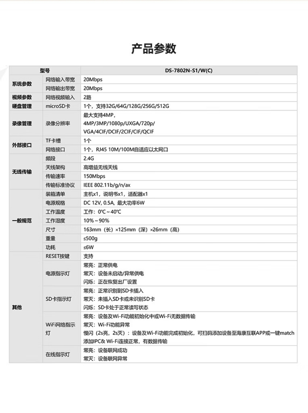 海康威视 DS-7802N-S1/W 无线硬盘录像机2路监控主机NVR
