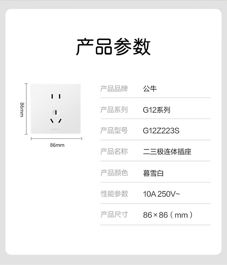 公牛 G12系列 10A正五孔插座86型插座面板 G12Z223S 白