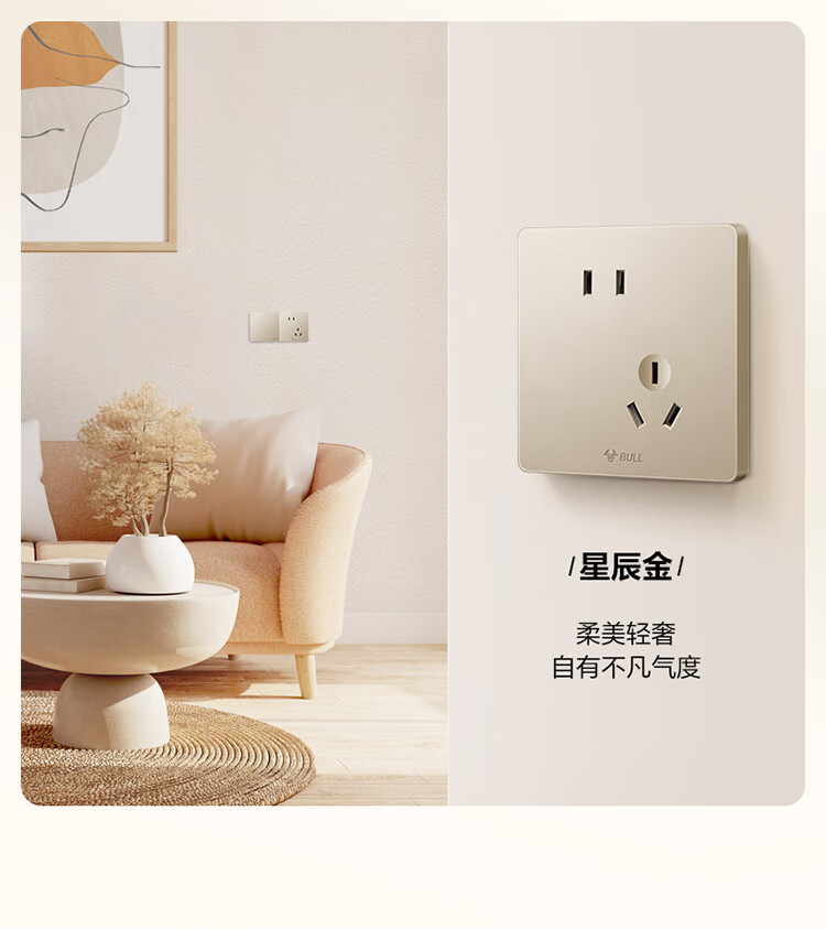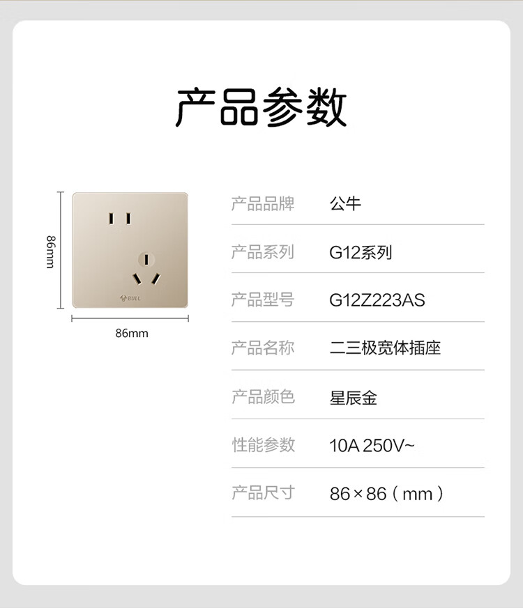 公牛 G12系列 10A斜五孔插座86型插座面板 G12Z223S 香槟金