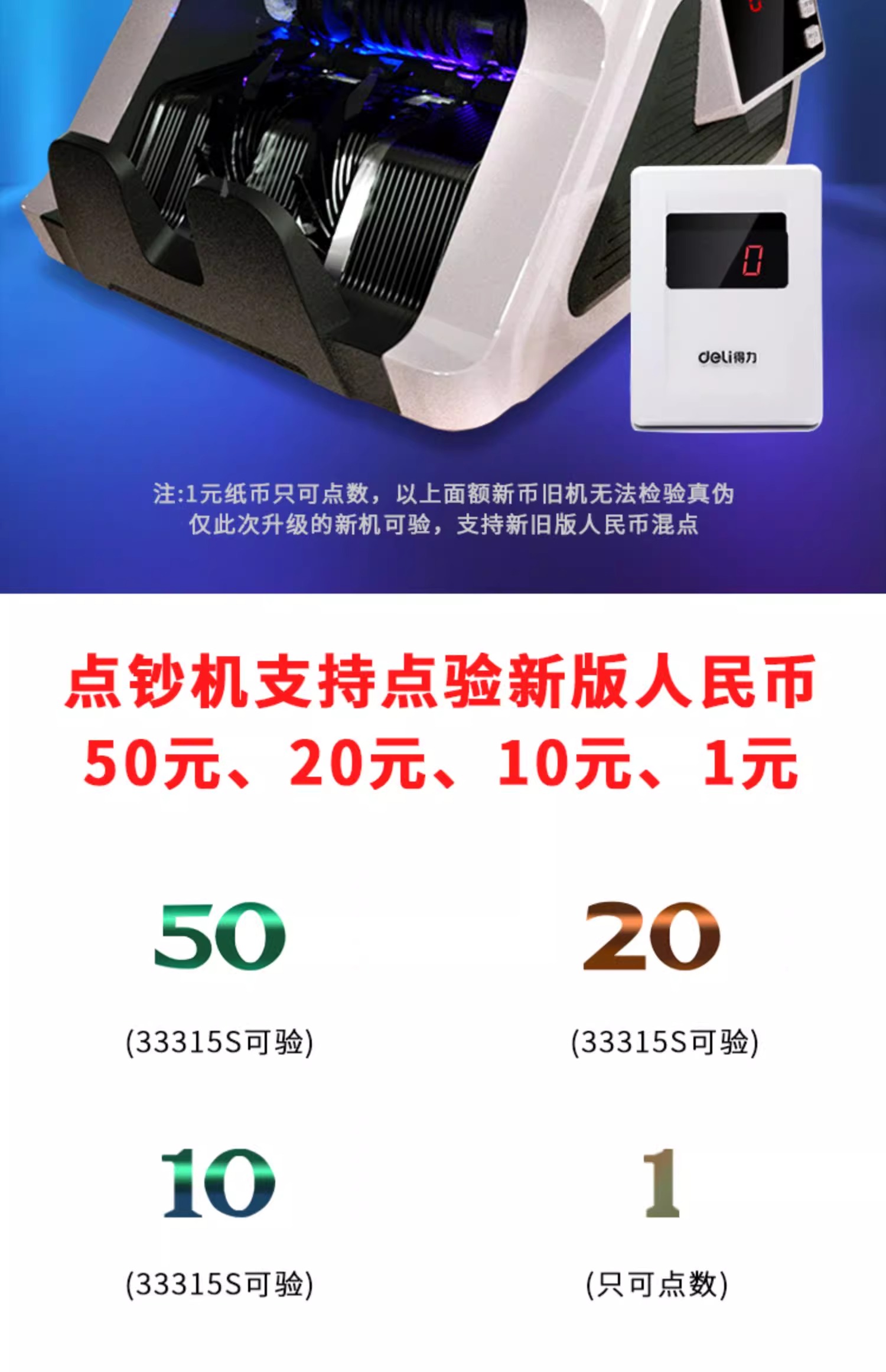 得力点钞机 验钞支持新版人民币 银行专用收银商用验钞 B类三屏数钱数钞机33315S